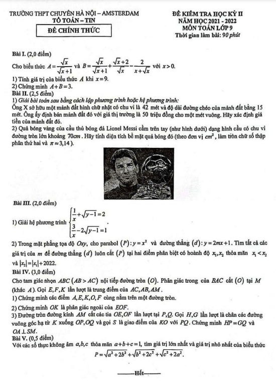 Trích dẫn đề thi học kỳ 2 Toán lớp 9 năm 2021 – 2022 trường chuyên Hà Nội Amsterdam: