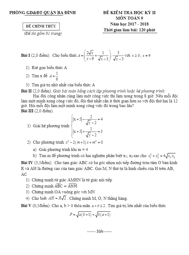 Đề thi Toán học kỳ 2 lớp 9 năm học 2017 – 2018 phòng GD và ĐT Ba Đình Hà Nội