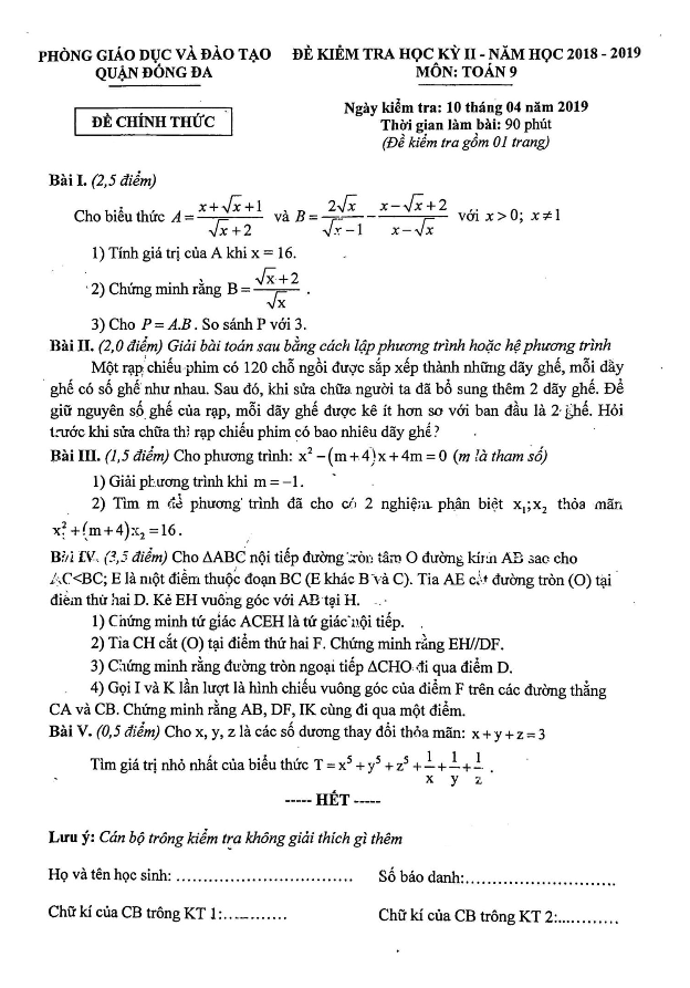 Đề thi học kỳ 2 Toán lớp 9 năm học 2018 – 2019 phòng GD&ĐT Đống Đa Hà Nội