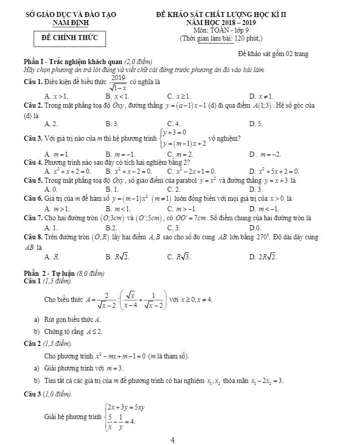 Vào ngày Thứ Ba, 09 tháng 04 năm 2019, sở Giáo dục và Đào tạo Nam Định đã tổ chức kỳ thi khảo sát chất lượng học kỳ 2 môn Toán lớp 9 năm học 2018 – 2019. Kỳ thi nhằm mục đích kiểm tra lại những kiến thức Toán mà học sinh lớp 9 đã học trong thời gian vừa qua.