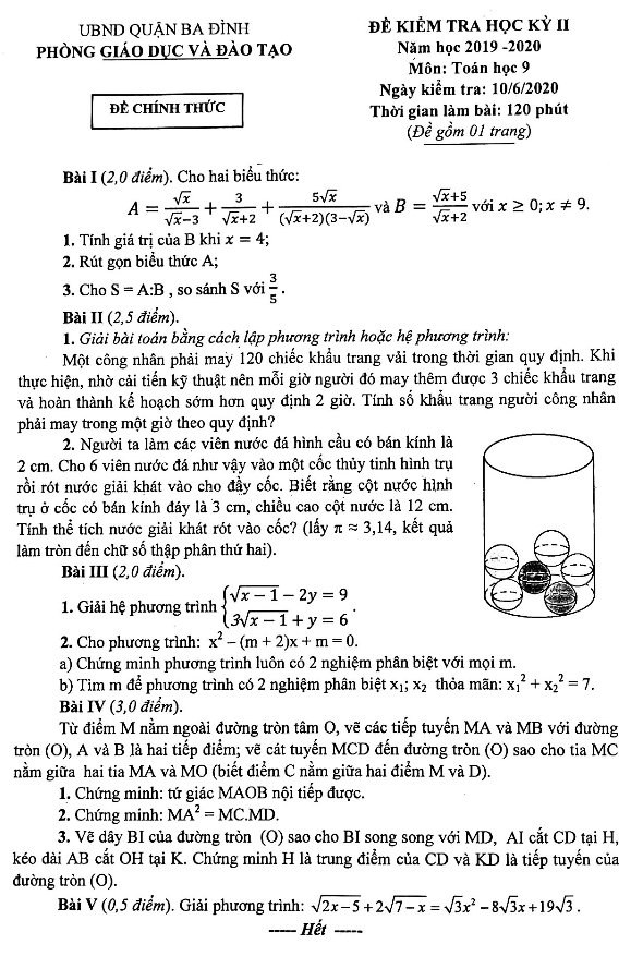 Ngày 10 tháng 06 năm 2020, phòng Giáo dục và Đào tạo quận Ba Đình, Hà Nội đã tổ chức kỳ thi kiểm tra học kỳ 2 môn Toán lớp 9 năm học 2019 – 2020. Đề thi này bao gồm 05 bài toán dạng tự luận, với thời gian làm bài là 90 phút.