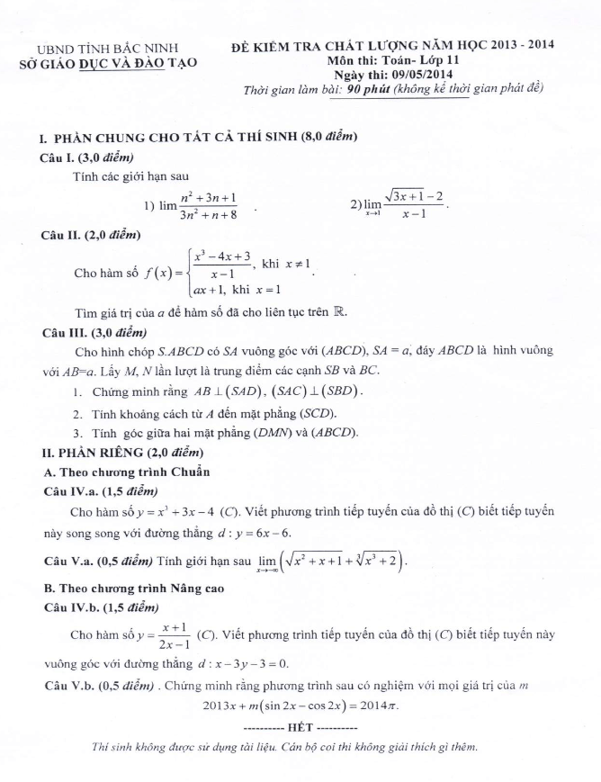 Đề thi học kì 2 (HK2) sở GD và ĐT Bắc Ninh năm 2013 – 2014