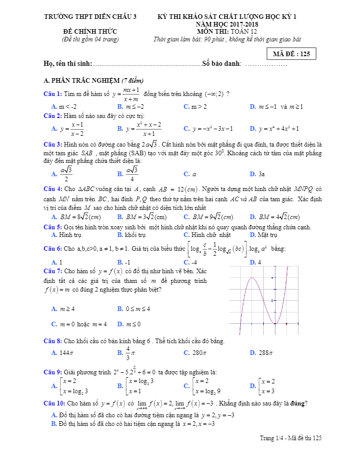 Đề thi học kỳ I lớp 12 môn Toán năm học 2017-2018 trường THPT Diễn Châu 3 Nghệ AnĐề thi học kỳ I môn Toán lớp 12 năm học 2017-2018 của trường THPT Diễn Châu 3 Nghệ An có mã đề 125, bao gồm 4 trang với tổng cộng 35 câu hỏi trắc nghiệm khách quan và 2 bài toán tự luận. Thời gian hoàn thành đề thi là 90 phút, không tính thời gian giao đề bài.Một số câu hỏi trong đề thi:1. Cho hàm số y = f(x) có giới hạn lim f(x) = 2 khi x tiến đến dương vô cùng, lim f(x) = -3 khi x tiến đến âm vô cùng. Khẳng định nào sau đây là đúng? A. Đồ thị hàm số có hai đường tiệm cận ngang là y = 2, y = -3 B. Đồ thị hàm số có hai tiệm cận ngang là x = 2, x = -3 C. Đồ thị hàm số có đúng một tiệm cận ngang D. Đồ thị hàm số không có tiệm cận ngang2. Cho tam giác ABC vuông cân tại A, cạnh AB = 12 cm. Dựng hình chữ nhật MNPQ có cạnh MN nằm trên BC, hai đỉnh P, Q lần lượt trên AC và AB. Xác định vị trí của điểm M sao cho diện tích hình chữ nhật là lớn nhất.3. Cho hình chóp S.ABCD, có đáy ABCD là hình vuông tâm O, cạnh a. Biết SA vuông góc (ABCD), SC = a√3. Tính thể tích khối chóp theo a và khoảng cách từ điểm D đến mặt phẳng (AMN), biết M là trung điểm BC, N là trung điểm trên cạnh SD.Nội dung trên đây giúp bạn hiểu rõ về đề thi toán học kỳ I của lớp 12 tại trường THPT Diễn Châu 3 Nghệ An. Để học tốt môn Toán, hãy rèn luyện và ôn tập thật kỹ trước khi tham gia bài kiểm tra. Chúc bạn thành công!