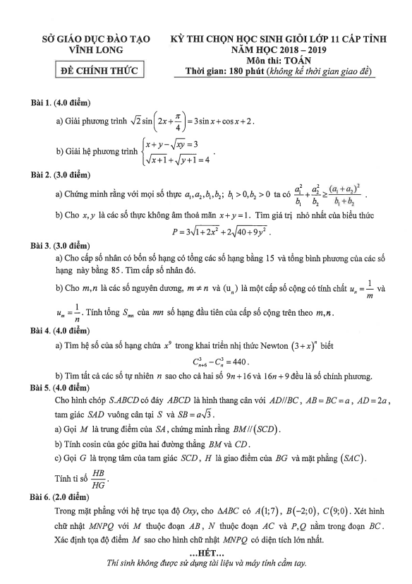 Đề thi học sinh giỏi cấp tỉnh lớp 11 môn Toán năm 2018 2019 sở GD ĐT Vĩnh Long: