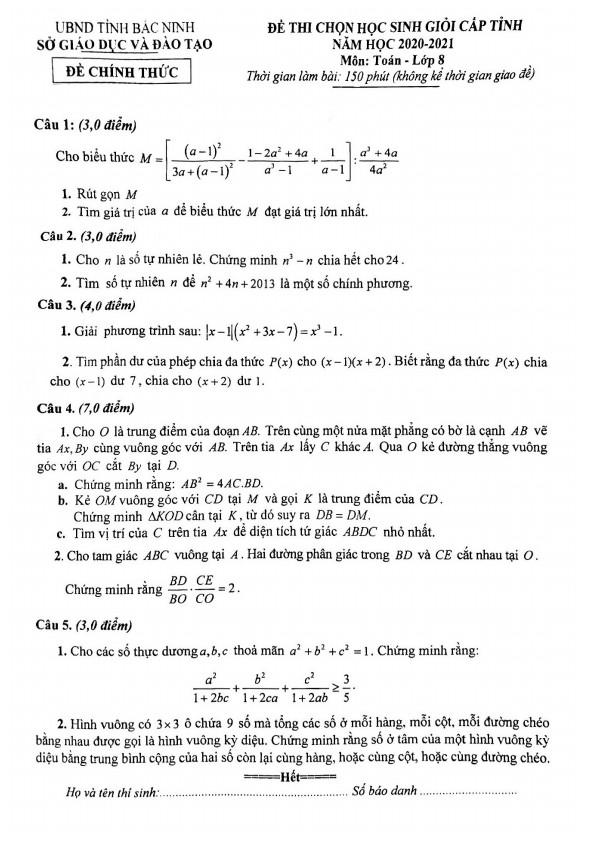 Đề thi học sinh giỏi cấp tỉnh lớp 8 môn Toán năm 2020 2021 sở GD ĐT Bắc Ninh