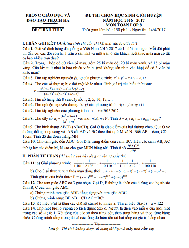 Chào các thầy cô và các em học sinh lớp 8, dưới đây là đề thi học sinh giỏi huyện Toán lớp 8 năm 2016-2017 của phòng GD&ĐT Thạch Hà – Hà Tĩnh. Đề thi bao gồm đáp án, lời giải và thang điểm. Mời các bạn cùng tham gia!