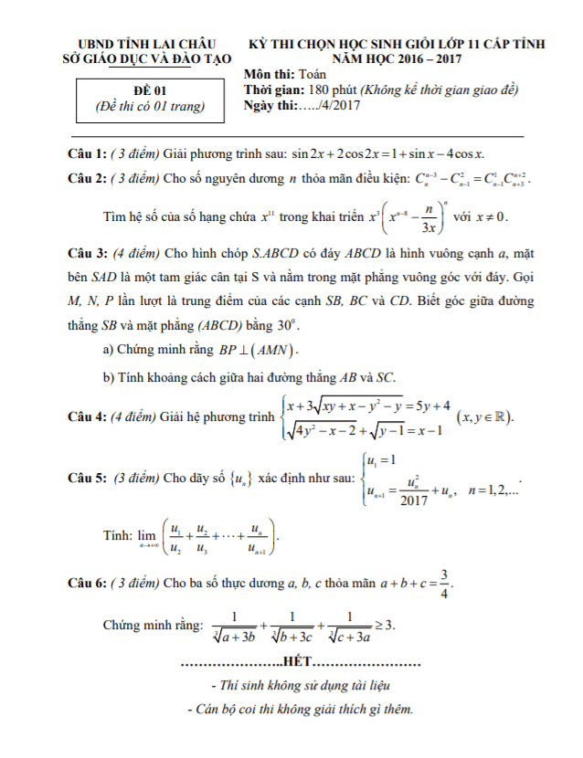 Đề thi học sinh giỏi Toán lớp 11 cấp tỉnh năm 2016 – 2017 sở GD&ĐT Lai Châu