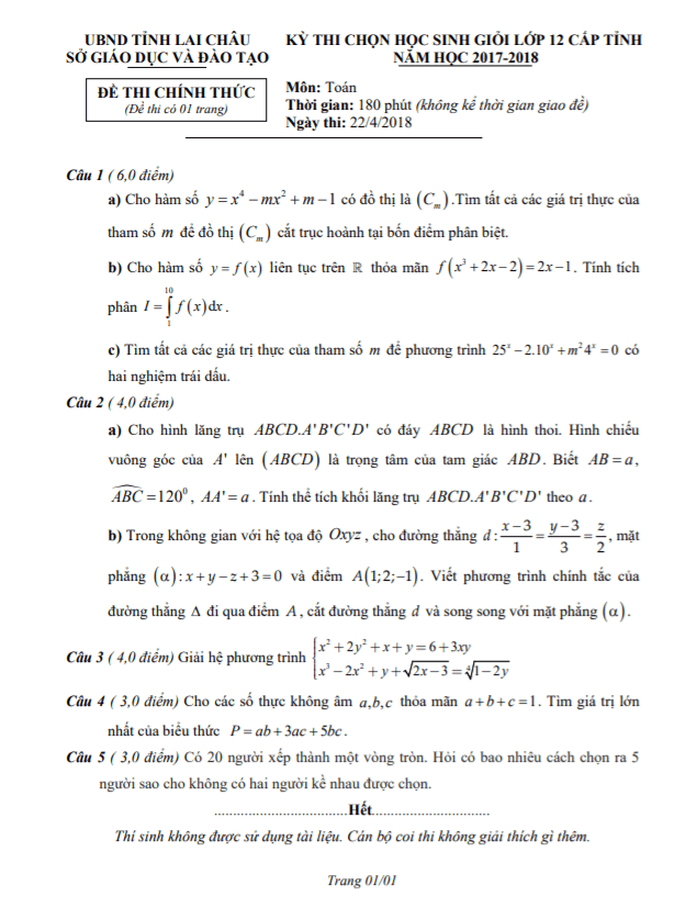 Đề thi học sinh giỏi lớp 12 môn Toán cấp tỉnh năm 2017 2018 sở GD ĐT Lai Châu