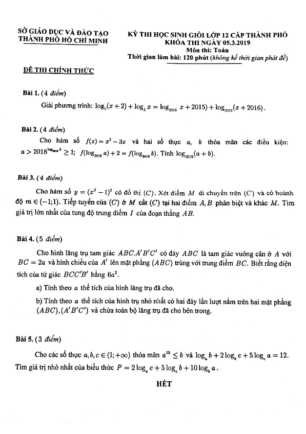 Đề thi HSG Toán lớp 12 năm 2019 sở GD&ĐT TP Hồ Chí Minh