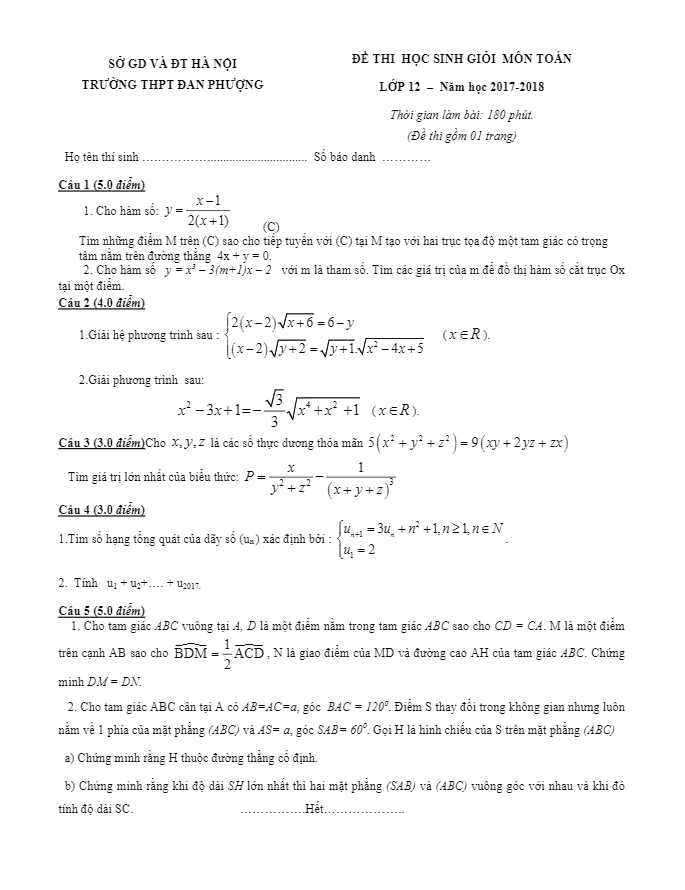 Đề thi học sinh giỏi môn Toán lớp 12 năm học 2017 – 2018 trường THPT Đan Phượng – Hà Nội