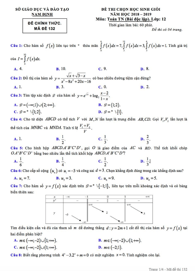 Đề thi học sinh giỏi Toán lớp 12 năm học 2018 – 2019 sở GD&ĐT Nam Định