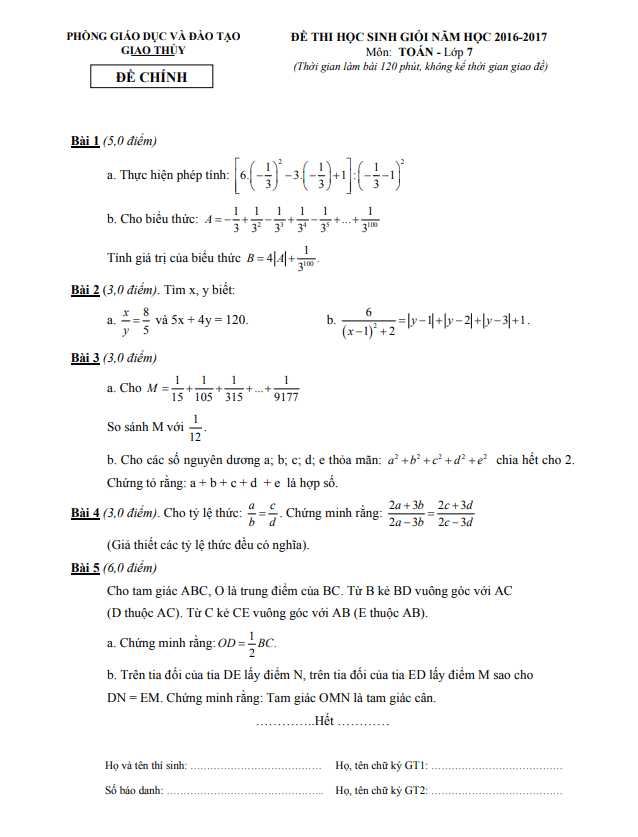 xin giới thiệu đến quý thầy cô và các em học sinh lớp 7 đề thi học sinh giỏi môn Toán năm 2016 – 2017 của phòng GD&ĐT Giao Thủy – Nam Định. Đề thi này bao gồm đáp án và lời giải chi tiết cho các câu hỏi sau:1. Trong tam giác ABC, điểm O là trung điểm của đoạn thẳng BC. Kẻ đường thẳng BD vuông góc với AC tại điểm D, và kẻ đường thẳng CE vuông góc với AB tại điểm E. a. Chứng minh rằng OD || BC.b. Trên tia đối của tia DE, chọn điểm N; trên tia đối của tia ED, chọn điểm M sao cho DN = EM. Chứng minh rằng tam giác OMN là tam giác cân.2. Cho các số nguyên dương a, b, c, d, e chia hết cho 2. Chứng minh rằng a + b + c + d + e là số hợp.3. Cho tỷ lệ thức: a/b = c/d. Chứng minh rằng a^2/b^2 = c^2/d^2 (với điều kiện các tỷ lệ thức đều khác không).Hi vọng đề thi này sẽ giúp các em học sinh lớp 7 rèn luyện và củng cố kiến thức Toán một cách hiệu quả. Chúc quý thầy cô và các em thành công!