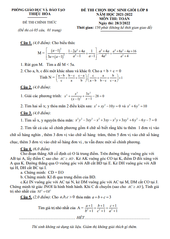 Đề thi học sinh giỏi lớp 8 môn Toán năm 2021-2022 phòng GD&ĐT Thiệu Hóa Thanh Hóa
