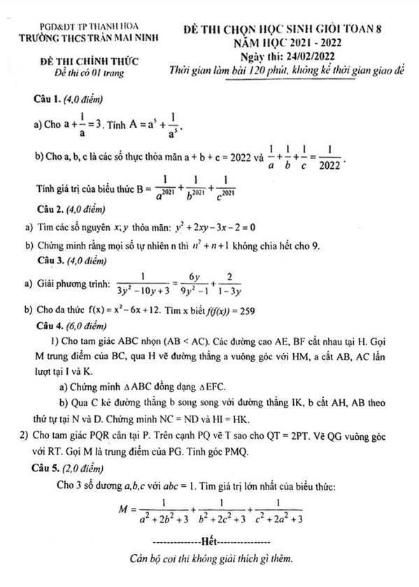 Xin chào quý thầy cô và các em học sinh lớp 8. Hôm nay, Sytu xin giới thiệu đến các bạn đề thi học sinh giỏi môn Toán lớp 8 năm học 2021 – 2022 của trường THCS Trần Mai Ninh, tỉnh Thanh Hóa. Kỳ thi sẽ diễn ra vào ngày 24 tháng 02 năm 2022.