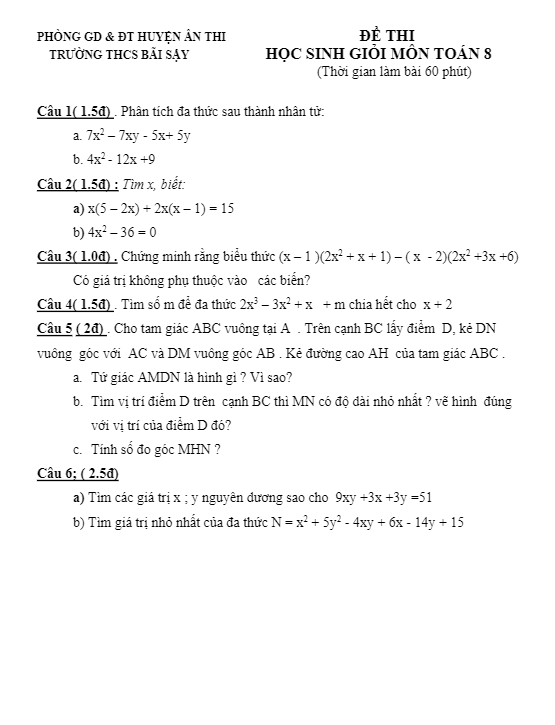 Đề thi học sinh giỏi môn Toán lớp 8 trường THCS Bãi Sậy – Hưng Yên được thiết kế với 6 bài toán tự luận, dành cho học sinh có kiến thức và kỹ năng Toán cao cấp. Thời gian làm bài được giới hạn trong 60 phút để thử thách sự nhanh nhạy và chính xác của thí sinh.