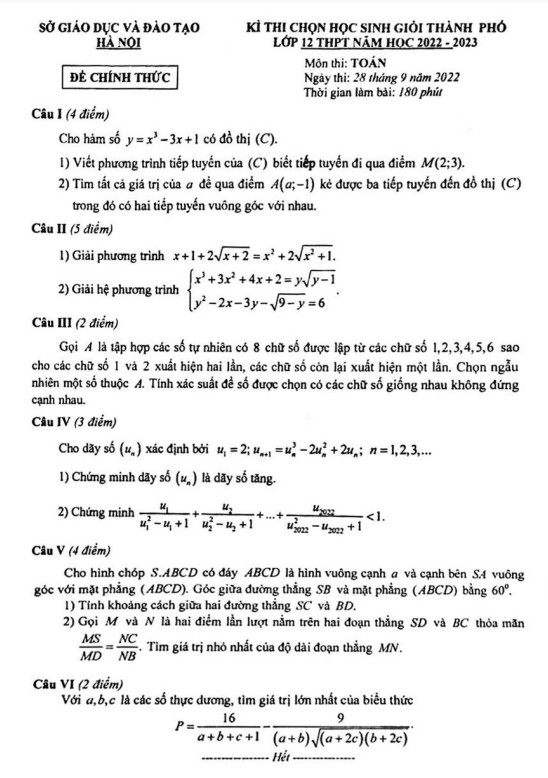 Sytu xin gửi đến quý thầy cô và các em học sinh lớp 12 bộ đề thi chọn học sinh giỏi lớp 12 môn Toán năm học 2022-2023 của sở Giáo dục và Đào tạo thành phố Hà Nội. Kỳ thi sẽ diễn ra vào ngày 28 tháng 09 năm 2022. Dưới đây là một số câu hỏi trong đề thi: