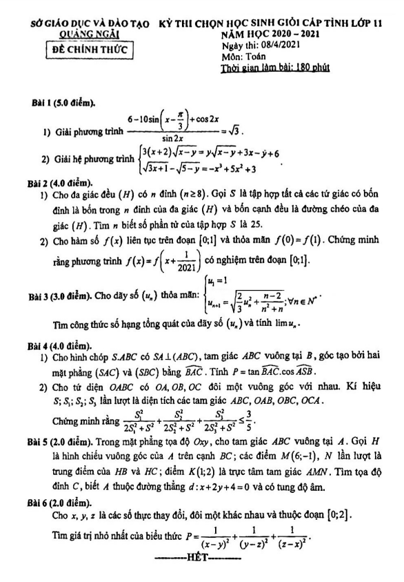 Chiều thứ Năm, ngày 08 tháng 04 năm 2021, Sở Giáo dục và Đào tạo tỉnh Quảng Ngãi đã tổ chức kỳ thi chọn học sinh giỏi cấp tỉnh lớp 11 môn Toán cho năm học 2020-2021. Đề thi gồm 01 trang với 06 bài toán dạng tự luận, và thời gian làm bài thi là 180 phút.