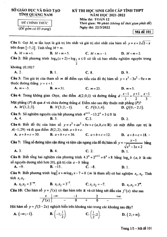 Đề thi chọn học sinh giỏi cấp tỉnh môn Toán lớp 12 năm học 2021-2022 sở GD&ĐT Quảng Nam có mã đề 101, bao gồm 05 trang với tổng cộng 40 câu trắc nghiệm. Thời gian làm bài là 90 phút, kỳ thi diễn ra vào ngày 22 tháng 03 năm 2022.
