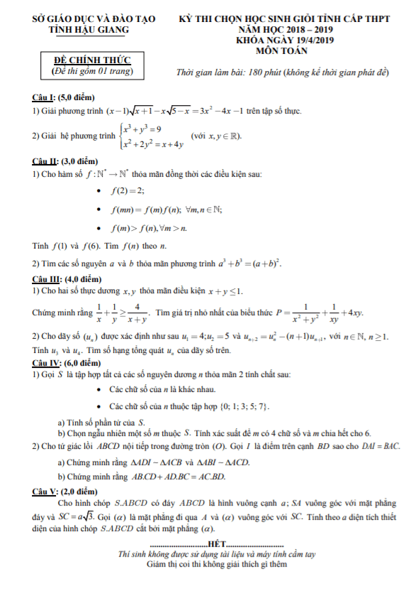 Trích dẫn đề thi học sinh giỏi Toán THPT cấp tỉnh năm 2018 – 2019 sở GD&ĐT Hậu Giang: