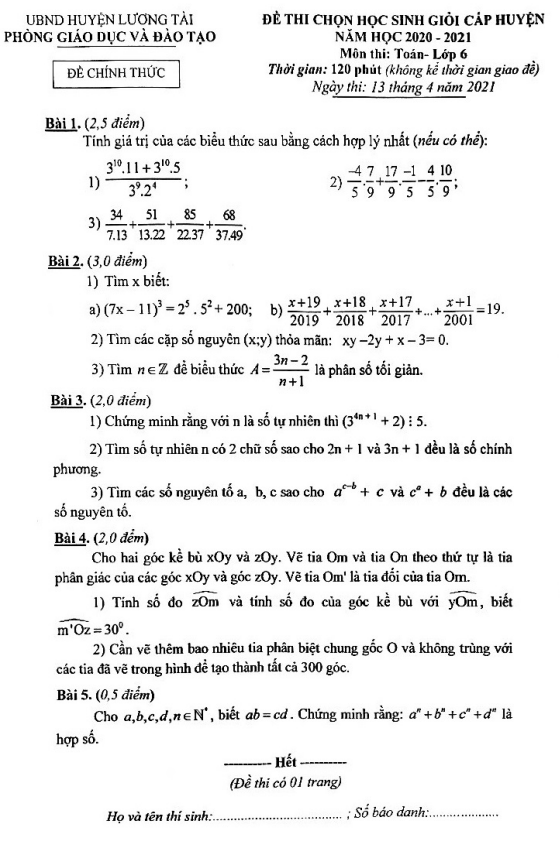 Đề thi HSG cấp huyện lớp 6 môn Toán năm 2020 2021 phòng GD ĐT Lương Tài Bắc Ninh