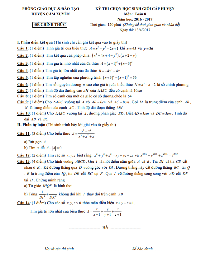 Đề thi HSG cấp huyện Toán lớp 8 năm 2016 – 2017 phòng GD&ĐT Cẩm Xuyên – Hà Tĩnh