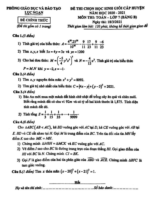 Đề thi HSG huyện lớp 7 môn Toán năm 2020-2021 phòng GD&ĐT Lục Ngạn Bắc Giang