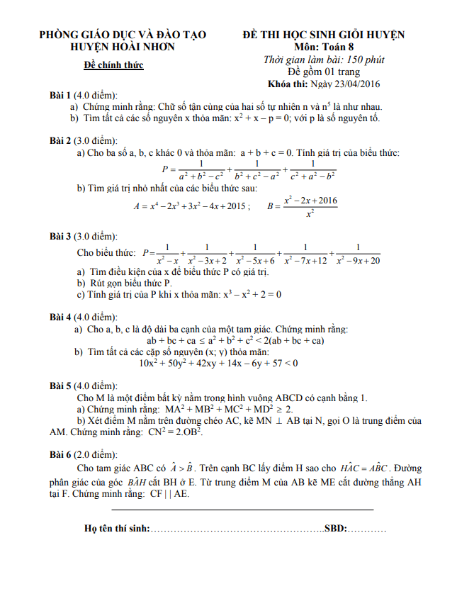Đề thi HSG huyện Toán lớp 8 năm 2015 – 2016