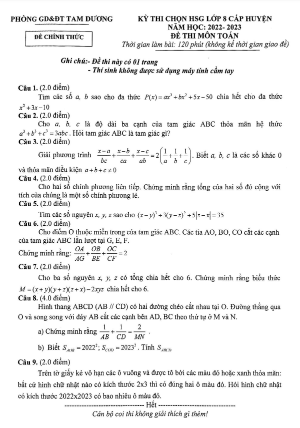Chào mừng quý thầy, cô giáo và các em học sinh lớp 8! Sytu xin giới thiệu đến các bạn đề thi chọn học sinh giỏi cấp huyện môn Toán lớp 8 năm học 2022 – 2023 do phòng Giáo dục và Đào tạo huyện Tam Dương, tỉnh Vĩnh Phúc tổ chức. Đề thi bao gồm 09 bài toán tự luận, thời gian làm bài là 120 phút.