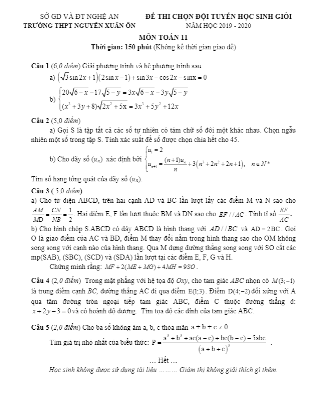 Đề thi HSG lớp 11 môn Toán năm 2019 2020 trường THPT Nguyễn Xuân Ôn Nghệ An