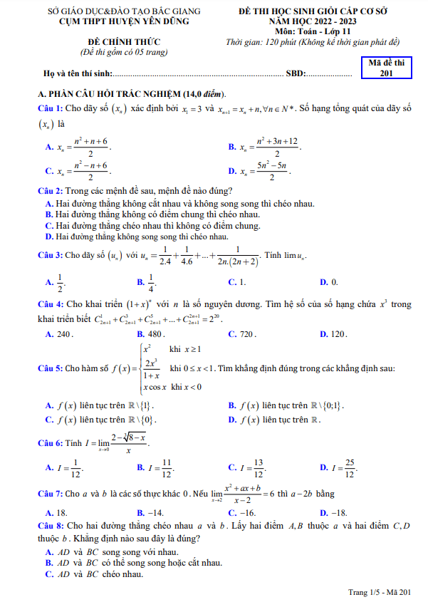 Đề thi HSG lớp 11 môn Toán năm 2022 2023 cụm THPT huyện Yên Dũng Bắc Giang