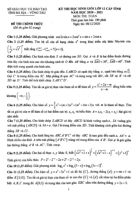 Vào sáng thứ Ba ngày 08 tháng 12 năm 2020, Sở Giáo dục và Đào tạo tỉnh Bà Rịa – Vũng Tàu đã tổ chức kỳ thi chọn học sinh giỏi lớp 12 cấp tỉnh môn Toán cho năm học 2020 – 2021. Đề thi này bao gồm 02 trang với 16 bài toán tự luận, thời gian làm bài là 180 phút.