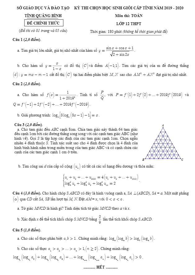 Ngày 10 tháng 12 năm 2019, Sở Giáo dục và Đào tạo tỉnh Quảng Bình đã tổ chức kỳ thi chọn học sinh giỏi cấp tỉnh môn Toán lớp 12 THPT năm học 2019-2020. Đề thi bao gồm 5 bài toán dạng tự luận trên 01 trang, thời gian làm bài thi là 90 phút và có lời giải chi tiết.