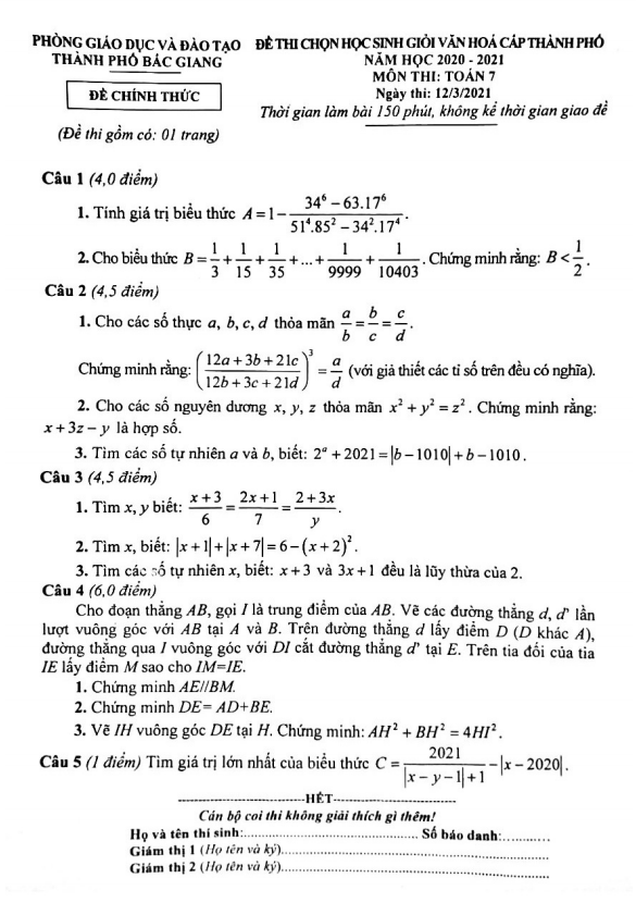 Ngày 12 tháng 03 năm 2021, Phòng Giáo dục và Đào tạo thành phố Bắc Giang đã tổ chức kỳ thi chọn học sinh giỏi văn hóa cấp thành phố môn Toán lớp 7 năm học 2020 – 2021. Đề thi HSG Toán lớp 7 năm 2020 – 2021 của phòng GD&ĐT Bắc Giang bao gồm 01 trang với 05 bài toán dạng tự luận, thời gian thi là 150 phút.