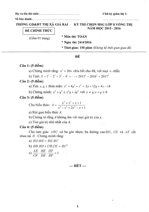 Đề thi HSG lớp 8 Toán năm 2015-2016 phòng GD&ĐT thị xã Giá Rai – Bạc Liêu