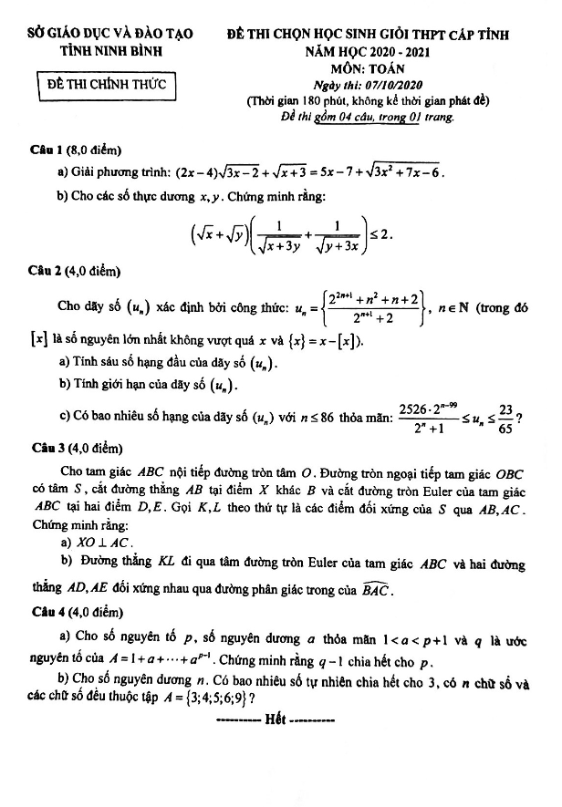 Vào sáng thứ Tư, ngày 07 tháng 10 năm 2020, Sở Giáo dục và Đào tạo tỉnh Ninh Bình đã tổ chức kỳ thi chọn học sinh giỏi THPT cấp tỉnh năm học 2020 – 2021 môn Toán. Bài thi này đặc biệt khó và đầy thử thách, đòi hỏi sự thông minh và sự kiên nhẫn của các thí sinh.