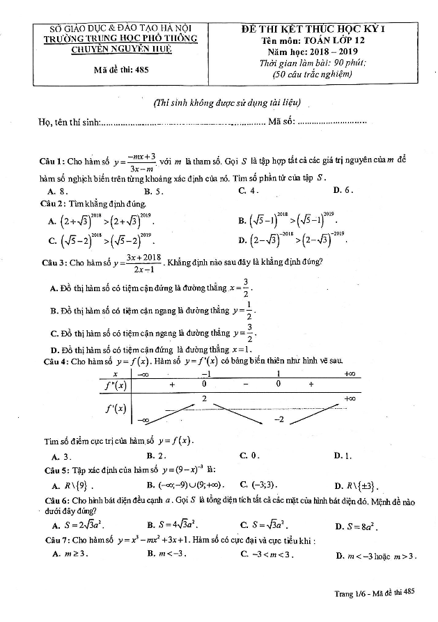 Xin chào quý thầy cô và các em học sinh khối 12! Hôm nay, mình muốn chia sẻ với các bạn đề thi kết thúc học kỳ 1 môn Toán lớp 12 năm học 2018 – 2019 của trường THPT chuyên Nguyễn Huệ – Hà Nội. Đề thi có mã đề 485, tổng cộng 50 câu hỏi và bài toán trắc nghiệm khách quan trải qua 6 trang. Kỳ thi đã diễn ra vào ngày 12 tháng 12 năm 2018 nhằm đánh giá toàn bộ kiến thức Toán lớp 12 mà các em đã học trong học kỳ 1 vừa qua.