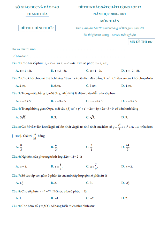 Đề thi khảo sát chất lượng lớp 12 môn Toán năm 2020 2021 sở GD ĐT Thanh Hóa