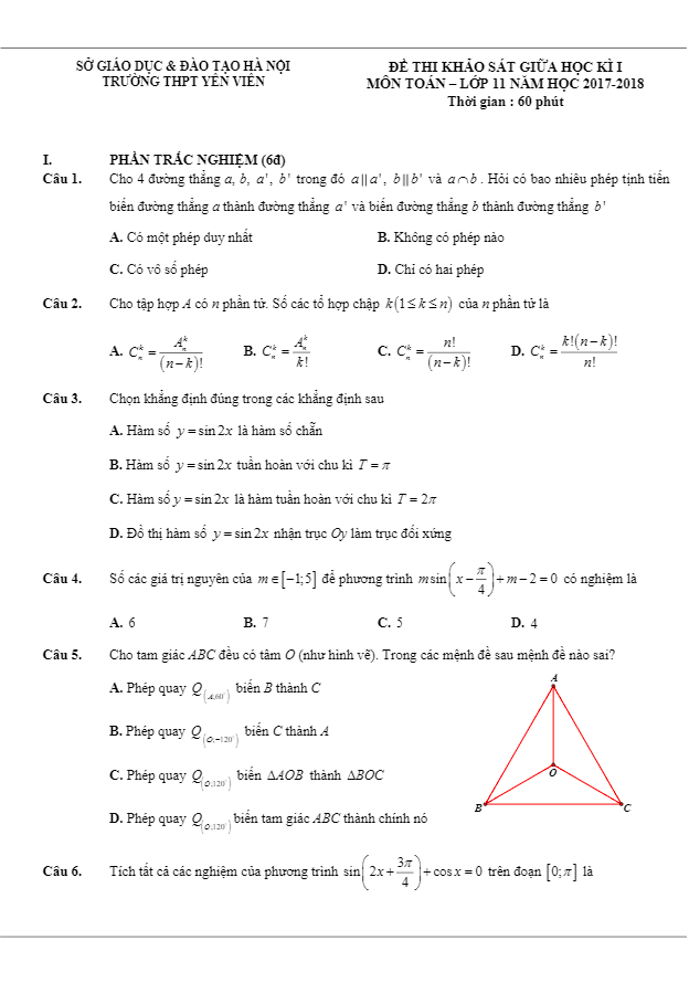 Đề thi khảo sát giữa học kỳ I môn Toán lớp 11 năm học 2017 – 2018 tại trường THPT Yên Viên – Hà Nội bao gồm 30 câu hỏi trắc nghiệm và 3 bài toán tự luận.