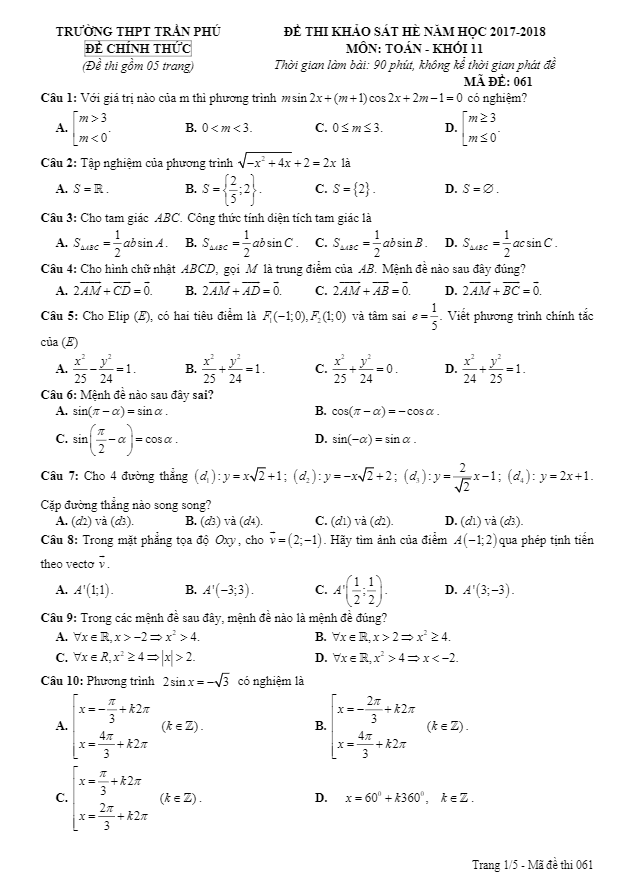 Đề thi khảo sát hè năm học 2017 2018 lớp 11 môn Toán trường THPT Trần Phú Vĩnh Phúc