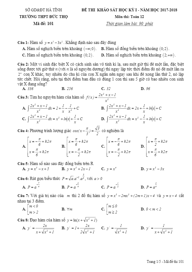 Đề thi khảo sát học kỳ 1 môn Toán lớp 12 năm học 2017 – 2018 của trường THPT Đức Thọ – Hà Tĩnh bao gồm 50 câu hỏi trắc nghiệm, thời gian làm bài 90 phút và có đáp án đi kèm.