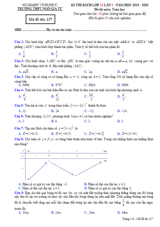Đề thi KSCĐ Toán lớp 12 lần 1 năm 2019-2020 của trường Ngô Gia Tự – Vĩnh Phúc có mã đề 137. Đề bao gồm 06 trang với 50 câu hỏi trắc nghiệm, thời gian làm bài được 90 phút. Đề thi này đánh giá kiến thức Toán lớp 11 và Toán lớp 12 mà học sinh đã học, và có đáp án đi kèm.