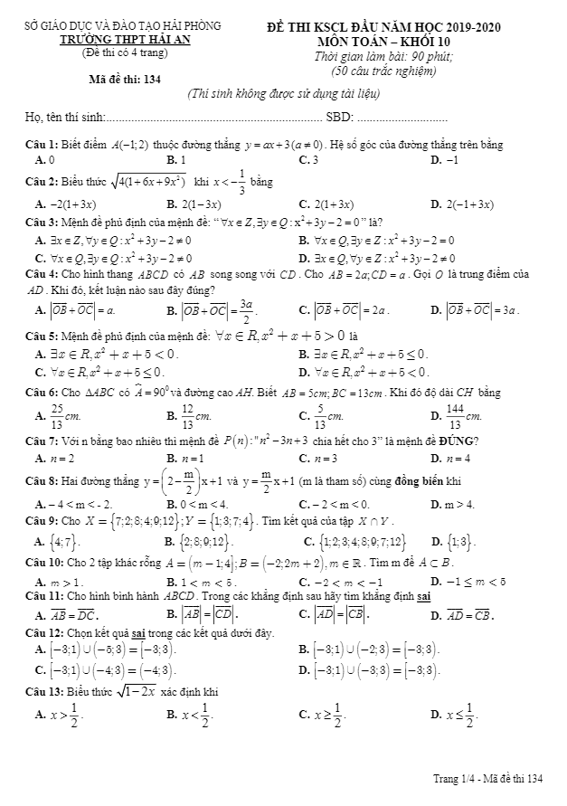 Đề thi KSCL đầu năm lớp 10 môn Toán năm 2019-2020 tại trường THPT Hải An đã diễn ra vào tuần vừa qua nhằm đánh giá kết quả học tập của học sinh sau những tuần học đầu tiên. Đề thi này được biên soạn dưới dạng đề trắc nghiệm với 50 câu hỏi và bài toán, mang mã số 134. Thời gian làm bài là 90 phút. Nội dung của đề thi tập trung vào các chủ đề Toán cơ bản mà học sinh lớp 10 đã học trong giai đoạn đầu của năm học. Đề thi có đáp án được công bố với các mã đề 134, 210, 356, 483, 568, 641, 709, 897.Một số điểm nổi bật trong đề thi bao gồm các câu hỏi như: mệnh đề đúng về vectơ, đẳng thức trong tam giác ABC và khẳng định sai về trung điểm. Đây là những câu hỏi giúp học sinh làm quen với cấu trúc và độ khó của đề thi, đồng thời giúp họ tự kiểm tra và củng cố kiến thức đã học.Đề thi này là cơ hội để học sinh thử sức, đánh giá và nâng cao kỹ năng giải các bài toán Toán. Hy vọng đề thi sẽ giúp học sinh chuẩn bị tốt cho năm học mới và đạt kết quả tốt trong học tập.