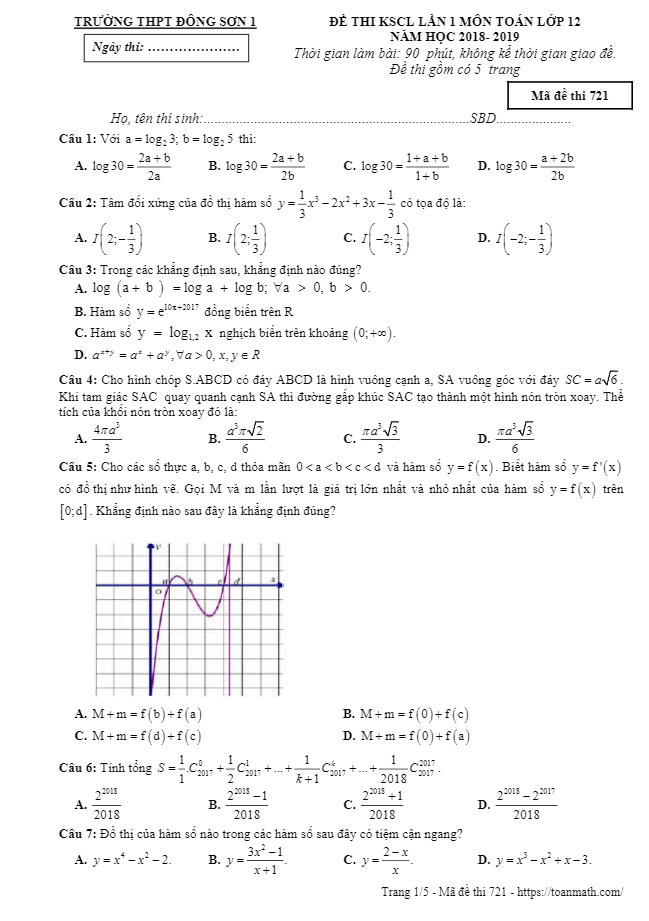 Đề thi KSCL lần 1 Toán lớp 12 năm 2018 – 2019 trường THPT Đông Sơn 1 – Thanh Hóa là một phần trong chuỗi đề rèn luyện, đánh giá thường xuyên nhằm chuẩn bị cho kỳ thi THPT Quốc gia môn Toán. Đề thi có mã đề 721, bao gồm 50 câu trắc nghiệm khách quan trải trên 05 trang, thời gian làm bài được dành 90 phút.