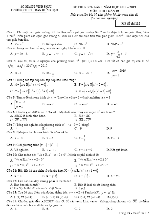 Đề thi KSCL lớp 10 môn Toán lần 1 năm 2018 2019 trường Trần Hưng Đạo Vĩnh Phúc