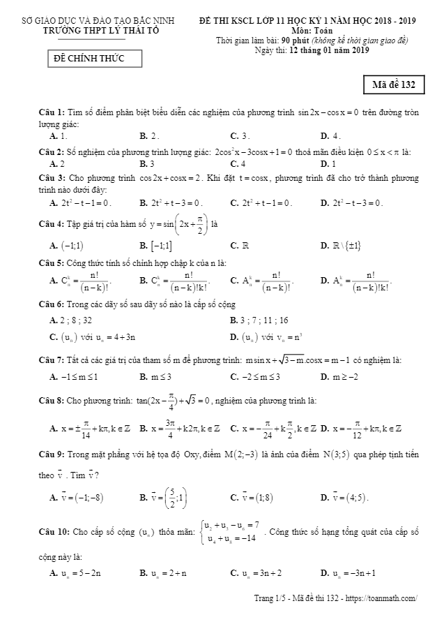 Đề thi KSCL Toán lớp 11 HK1 năm 2018 – 2019 trường Lý Thái Tổ – Bắc Ninh mã đề 132 đã được biên soạn nhằm đánh giá lại kiến thức Toán lớp 11 mà học sinh đã học trong học kỳ 1 vừa qua của năm học 2018 – 2019. Đề thi gồm 50 câu trắc nghiệm trên 05 trang, thí sinh có 90 phút để làm bài, và có đáp án.