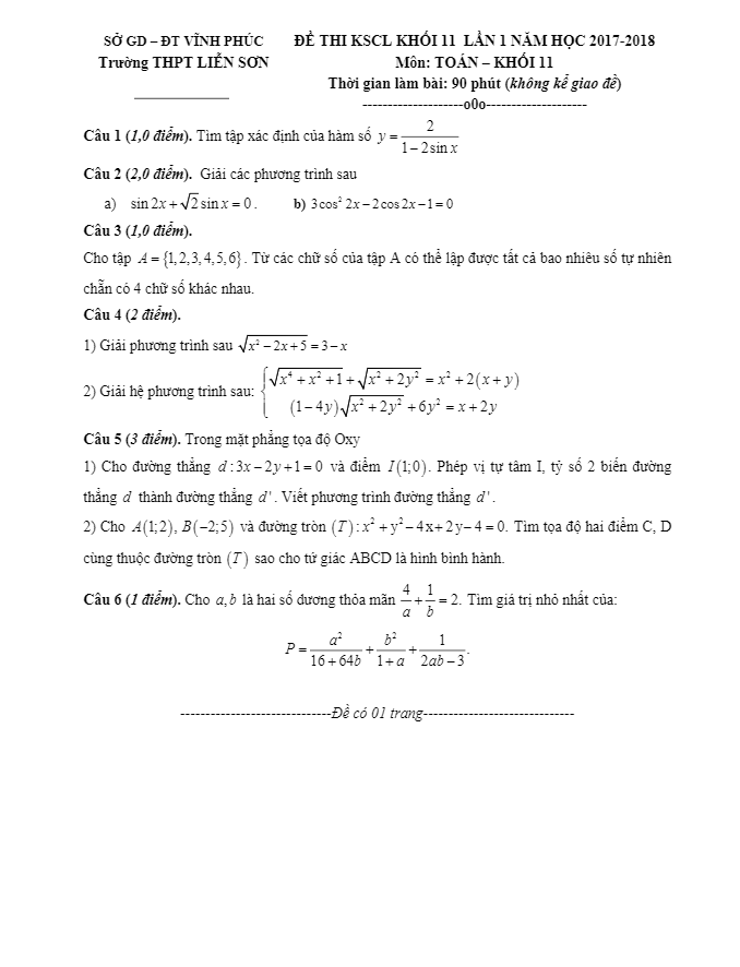 Đề thi KSCL Toán lớp 11 lần 1 năm học 2017 – 2018 trường THPT Liễn Sơn – Vĩnh Phúc bao gồm một trang với 6 bài toán tự luận, thời gian làm bài là 90 phút.