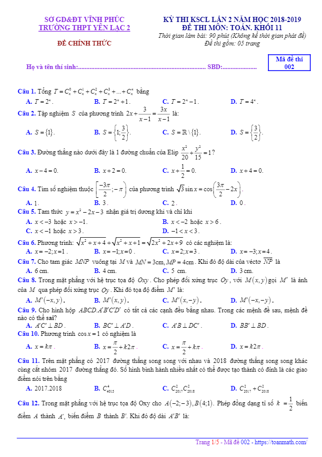 Đề thi Khảo sát chất lượng môn Toán lớp 11 lần 2 năm 2018-2019 của trường THPT Yên Lạc 2 – Vĩnh Phúc đã diễn ra gần đây nhằm đánh giá và nâng cao chất lượng học tập của học sinh trong giai đoạn giữa học kỳ 2. Đề thi được biên soạn theo hình thức trắc nghiệm khách quan với 50 câu hỏi và bài toán, thời gian làm bài là 90 phút và có đáp án để học sinh kiểm tra kết quả.Một số câu hỏi từ đề thi như sau:1. Trên mặt phẳng có 2017 đường thẳng song song với nhau và 2018 đường thẳng song song khác cùng cắt nhóm 2017 đường thẳng đó. Số hình bình hành nhiều nhất có thể được tạo thành có đỉnh là các giao điểm nói trên bằng?2. Trong các mệnh đề sau, mệnh đề nào sai? A. Các mặt bên của hình chóp cụt là các hình thang cân. B. Các mặt bên của hình chóp cụt là các hình thang. C. Đường thẳng chứa các cạnh bên của hình chóp cụt đồng quy tại một điểm. D. Trong hình chóp cụt thì hai đáy là hai đa giác có các cạnh tương ứng song song và các tỉ số các cặp cạnh tương ứng bằng nhau.3. Cho bốn số a, b, c, d theo thứ tự đó tạo thành cấp số nhân với công bội khác 1. Biết tổng ba số hạng đầu bằng 148/9, đồng thời theo thứ tự đó chúng lần lượt là số hạng thứ nhất, thứ tư và thứ tám của một cấp số cộng. Tính giá trị biểu thức T = a – b + c – d.Đề thi này giúp học sinh ôn tập kiến thức Toán và là cơ hội để nhà trường đánh giá, cải thiện chất lượng giáo dục. Chúc các em học sinh đạt kết quả cao trong kỳ thi này!
