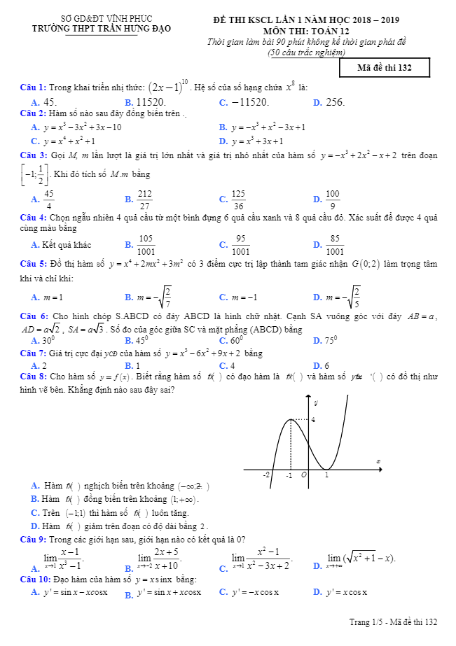 Đề thi KSCL lớp 12 môn Toán lần 1 năm 2018 2019 trường Trần Hưng Đạo Vĩnh Phúc