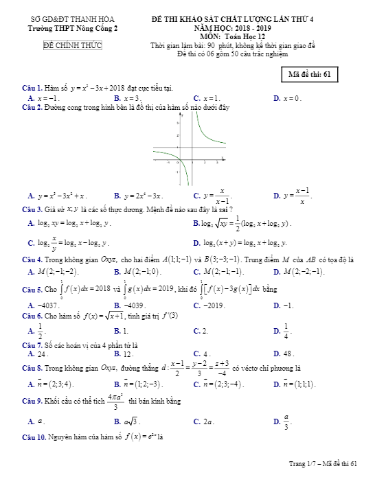 Đề thi KSCL lớp 12 môn Toán lần 4 năm 2018-2019 của trường THPT Nông Cống 2 Thanh Hóa đã được tổ chức nhằm kiểm tra kiến thức của học sinh trước kỳ thi THPT Quốc gia. Đề thi có mã đề 61, được biên soạn dưới dạng trắc nghiệm khách quan, gồm 50 câu hỏi và bài toán trải dài trên 7 trang. Thời gian làm bài của học sinh là 90 phút và đề thi có đáp án cho các mã đề từ 61 đến 64.Đề thi bao gồm nhiều nội dung thú vị như bài toán về xác suất chọn học sinh từ các khối hoặc bài toán về thể tích của khối trụ và khối nón. Một bài toán khác đề cập đến việc tính số tiền mà người đó sẽ nhận sau 6 năm với số vốn ban đầu là 100 triệu đồng và lãi suất 8.4%/năm.Đề thi cũng đánh giá kỹ năng tính toán, xử lý vấn đề và logic của học sinh lớp 12. Qua đó, giúp học sinh tự kiểm tra kiến thức và chuẩn bị tốt cho kỳ thi sắp tới.