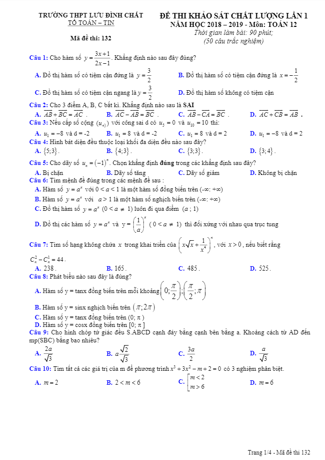 Đề thi KSCL lớp 12 môn Toán năm học 2018-2019 trường THPT Lưu Đình Chất Thanh Hóa lần 1